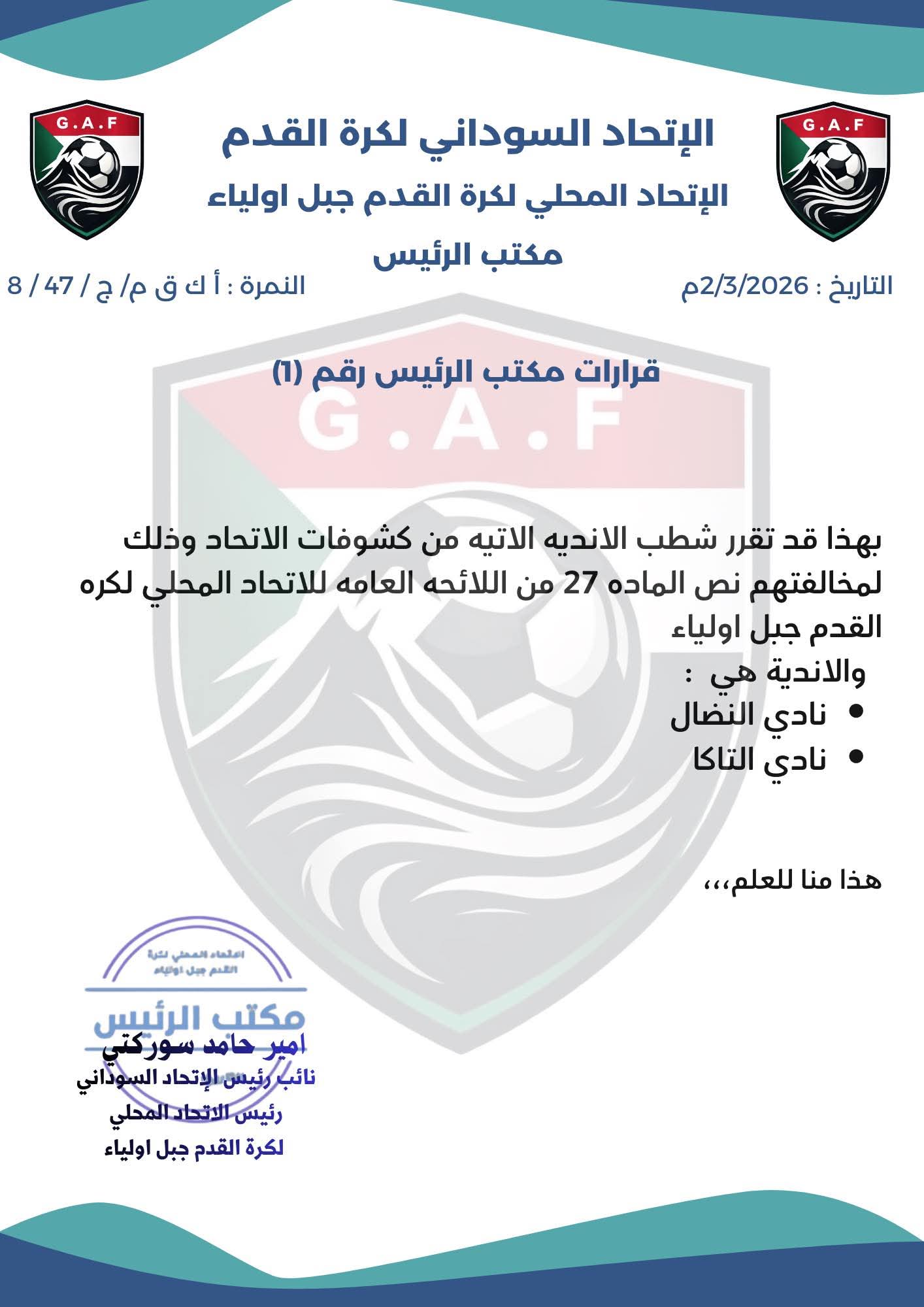 إتحاد جبل اولياء يشطب ناديا النضال والتاكا من كشوفات الاتحاد