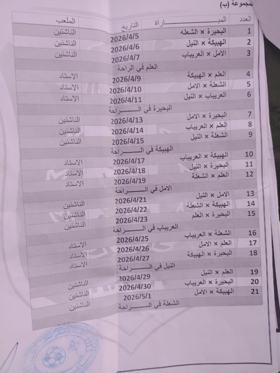 ومن جهة ثانية سينطلق دوري الدرجة الأولي الدورة الأولي بمدينة رفاعة في يوم الخامس من شهر ابريل عام ٢٠٢٦ وسيفتتح دوري هذا الموسم بلقاءين، المباراة الأولي تجمع بين فريقي البحيرة والشعلة و المباراة الثانية تجمع بين فريقا النهر والعزيبة .