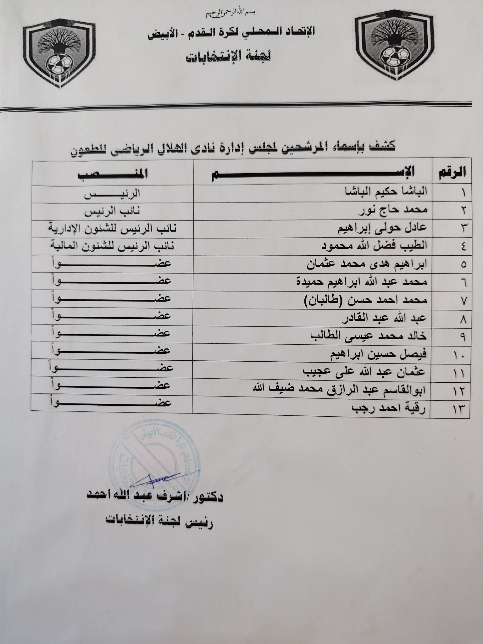 أعلنت لجنة الانتخابات بالاتحاد المحلي لكرة القدم عن قيام الجمعية العمومية لنادي هلال الأبيض يوم السبت الساعة 12 ظهرا بقاعة محلية شيكان، حيث تم تقديم قائمة وفاقية برئاسة العقيد ركن الباشا حكيم الباشا لتفوز بالتزكية لقيادة النادي..