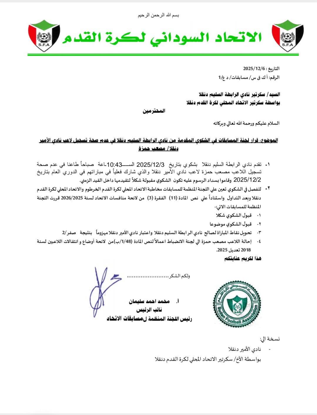 في انتصار إداري يُجسد قوة وحنكة مجلس إدارة نادي الرابطة السليم، كسب النادي الشكوى التي تقدّم بها ضد لاعب فريق الأمير دنقلا في مباراتهما السابقة ضمن مجموعات الدوري العام.