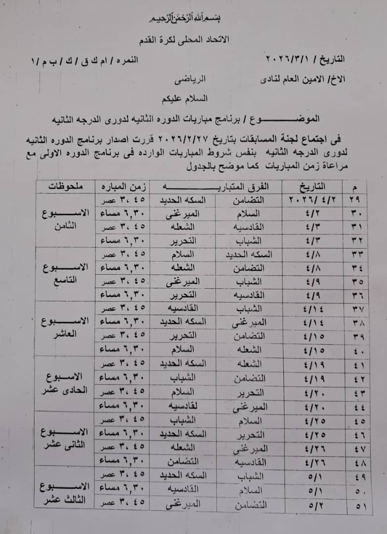 أصدرت لجنة المسابقات بالاتحاد المحلي تصدر برنامج الدورة الثانية لدوري الدرجة الثانية بكوستي والذي تقرر أن ينطلق في الثاني من أبريل القادم وجاءت البرمجة على النحو التالي :