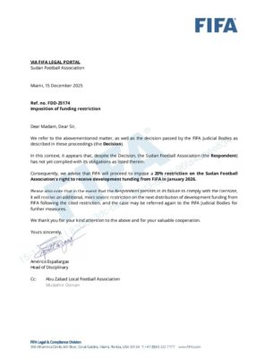 في تطور جديد للأحداث فرض الاتحاد الدولي لكرة القدم ( فيفا ) حظرا إضافيا بمقدار. 20% من الأموال المخصصة للتطوير للاتحاد السوداني لكرة القدم اعتبارا من يناير 2026م وذلك إلى حين السداد في قضية الاتحاد المحلي وابوزبد.