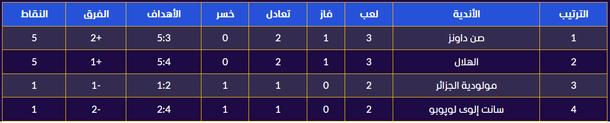 تعادل الهلال السوداني مع صن داونز أعاد ترتيب المجموعة الثالثة للاشتعال، حيث تساوى الفريقان في الصدارة برصيد 5 نقاط لكل منهما، بينما بقيت مولودية الجزائر وسانت لوبوبو في ذيل الترتيب بنقطة واحدة لكل فريق.