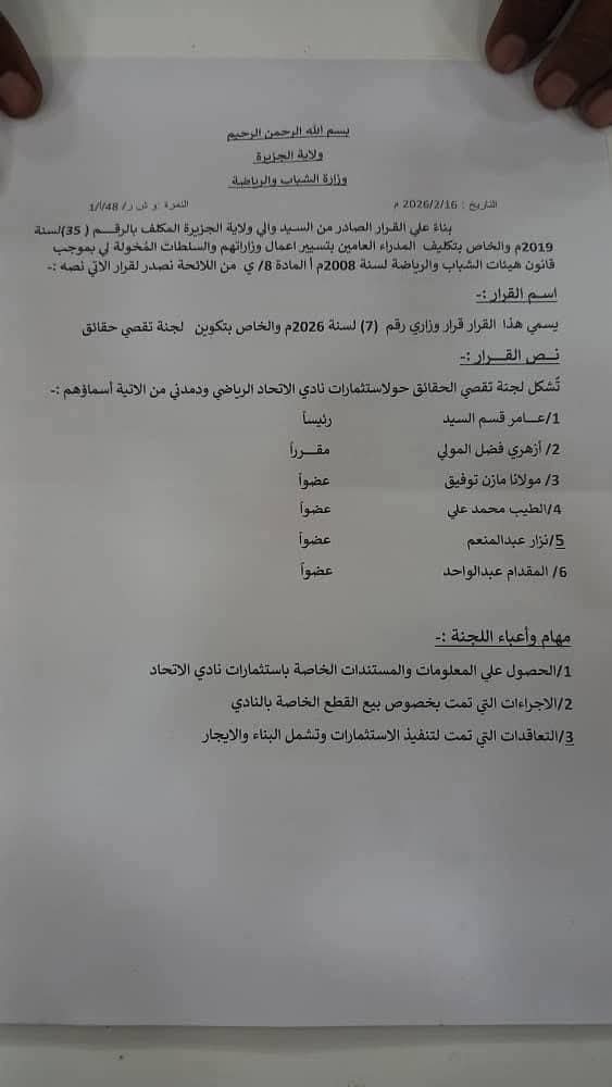 أصدر وزير الشباب والرياضة المكلف بولاية الجزيرة، طارق عبد الرحمن يوسف، قراراً وزارياً بالرقم (7) لسنة 2026م، قضى بتشكيل لجنة لتقصي الحقائق حول استثمارات نادي الاتحاد الرياضي بمدينة ودمدني.