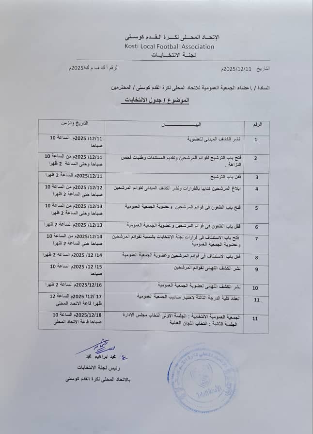 قام الإتحاد المحلي لكرة القدم بكوستي بنشر جدول الإنتخابات والذي تبدأ أعماله إبتداءاً من اليوم وحتى الثامن عشر من شهر ديسمبر موعد قيام الجمعية العمومية الإنتخابية لإختيار مجلس إدارة جديد للاتحاد المحلي لكرة القدم بكوستي، ويتضمن الجدول بالتواريخ كل الإجراءات المتعلقة بالعملية الإنتخابية .