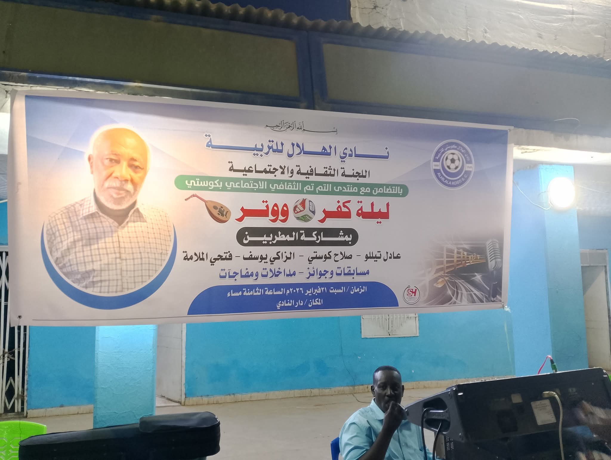 في إطار برنامجه الرمضاني للعام الجاري، دشّن نادي هلال كوستي فعاليات «الليالي الثقافية» بأمسية افتتاحية حملت عنوان «كفر ووتر»، وسط حضور جماهيري ورسمي مميز، عكس المكانة الاجتماعية والثقافية التي يتبوأها النادي في مدينة كوستي وولاية النيل الأبيض.
