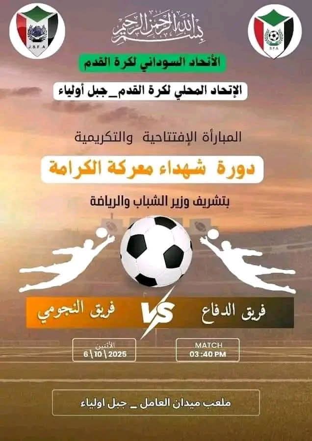 من جهته صرح الاستاذ امير حامد سوركتي نائب رئيس الاتحاد السوداني لكرة القدم رئيس الاتحاد المحلي لكرة القدم جبل اولياء قائلا :: باذن الله وبعد غياب ثلاث سنوات تستقبل جبل اولياء وملعب نادي العامل المباراة الافتتاحية لدورة شهداء معركة الكرامة بين فريقي الدفاع والنجومي من الدرجه الاولي.